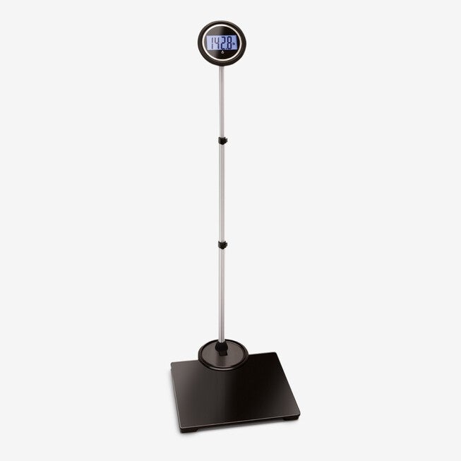 This convenient scale is adjustable for easy reading and features a large backlit screen. Switch between pounds, kilograms and stones. Adjust display over 4' to read easily.