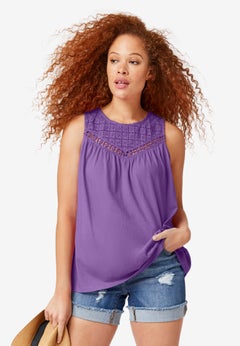 A departure from the basic, everyday tank top, our Crochet Lace Trim Tank Top has thin straps, a V-neck, and beautiful details around the neckline and hem. This tank is fitted around the upper bust and gradually widens near the hips. Pair this with our Ripped Knee Skinny Jeans for a trendy look, or with our High-Waist Wide Leg Jeans for a bohemian vibe.