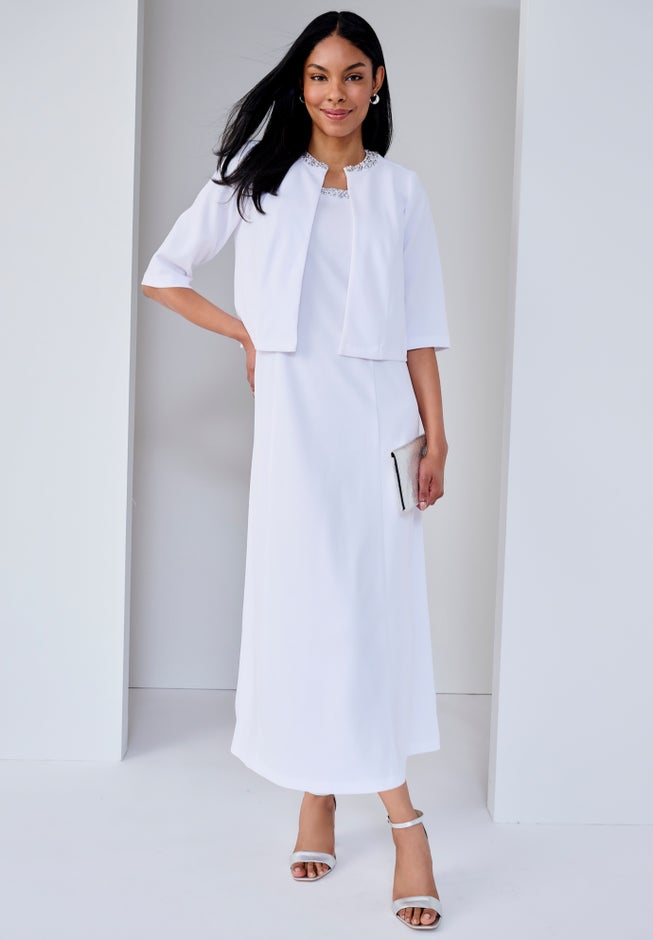 Featuring an eye-catching design and a figure flattering fit, there is not a thing about the Jessica London women's plus size 2-Piece Beaded Jacket Dress that isn't stylish. Beautifully beaded style that goes from corner office to corner table. Sleeveless A-line dress has back zipper; jacket has hook-and-eye closure.