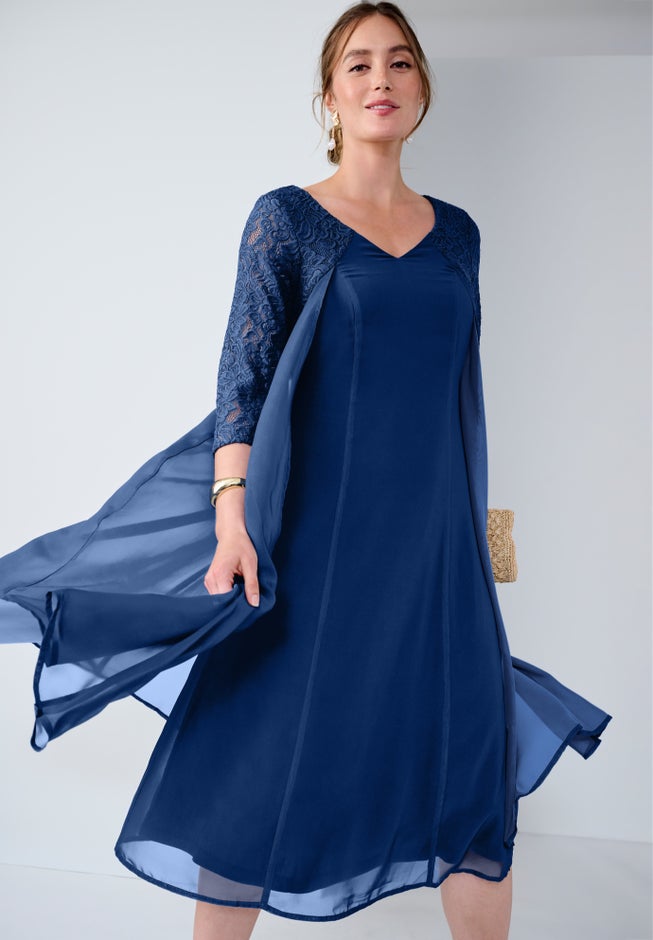 Prepare to be the best-dressed guest at any event in Jessica London’s elegant plus-size women’s georgette overlay dress. The semi-attached overlay adds dramatic flair, while the classic A-line silhouette is effortlessly flattering. Dazzling accessories complete the look perfectly.