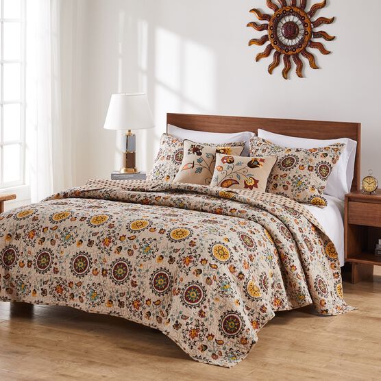 Fiery suzani sun discs and floral crests adorn this retro style quilt set. Reverses to an all-over foulard print. Machine quilted for durability and oversized for better coverage on today’s deeper mattresses. Set includes: Quilt and two pillow shams (one sham per twin set), plus two decorative pillows. ? Oversized for better coverage on today’s deeper mattresses. Prewashed and preshrunk. Set includes: Quilt and two pillow shams (one sham per twin set), plus two coordinating decorative pillows. All cotton face, back and fill. Care instructions: Machine wash. Dimensions: Twin Quilt 68x88”, Full/Queen Quilt 90x90”, King Quilt 105x95”, Standard Shams 20x36” each, King Shams (included in King Quilt Set) 20x36” each, Decorative Pillows 18x18” each.