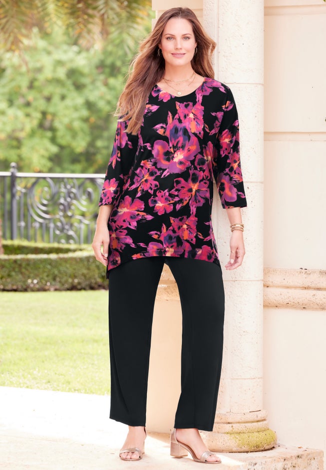 FIT: Relaxed and feminine tunic with an easy drape. V-neckline, 3/4 sleeves and slimming two-point hem with side slits.