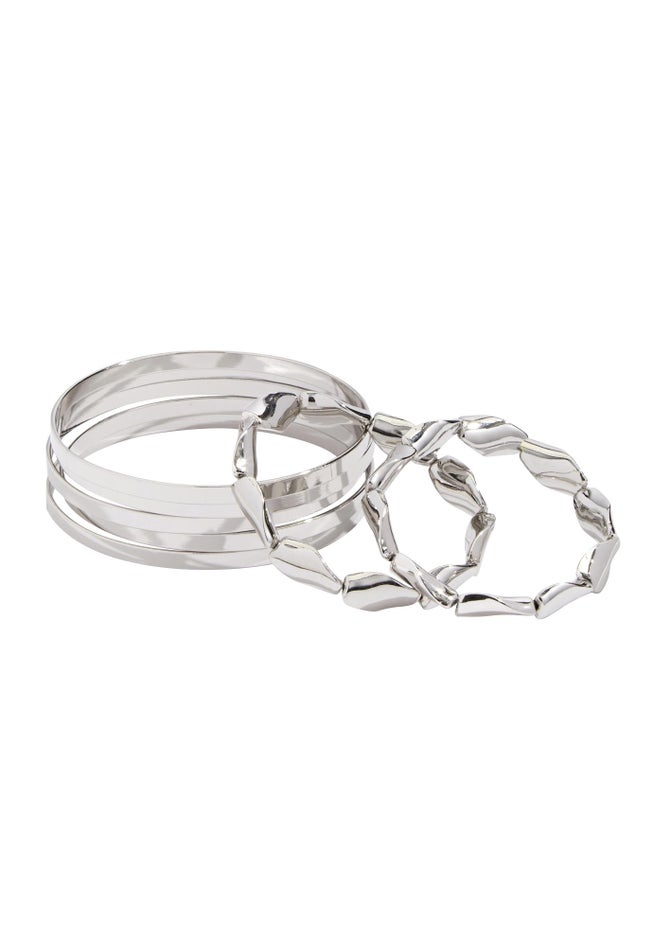 Adorn your outfit with this stackable mix of bangles—five metal and two elasticized styles can be worn together or separately.