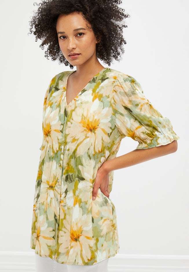 Item Number: 1078613With so many stylish details – ruffled sleeves, elastic cinching at waist, pearlized buttons –this tunic makes the outfit. Just pair it with skinny jeans or white pants for an instantly fashionable, casually feminine look.