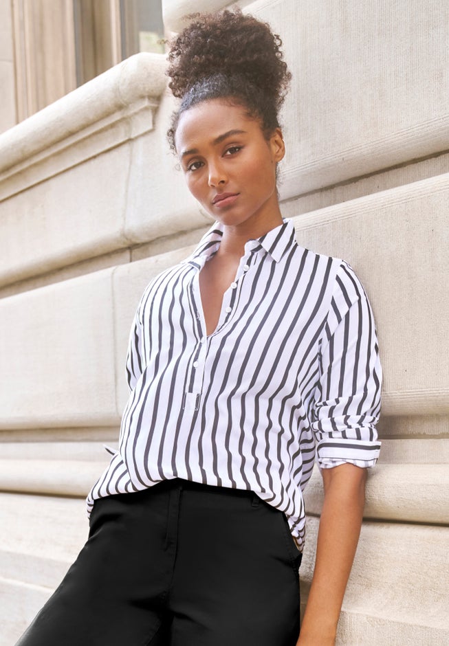Item Number: 1011179Keep cool and comfortable in our breezy tunic, cut in a relaxed silhouette with an easy popover fit. Featuring a classic shirt collar, 6-button placket and long sleeves with button cuffs, the back yoke with inverted pleat provides ease of movement.