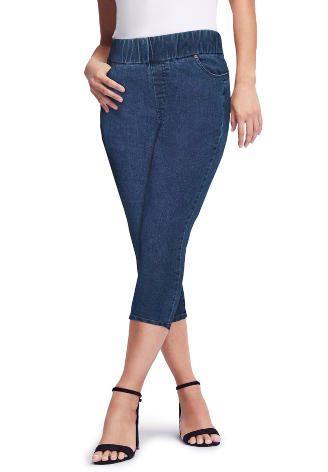 The super comfortable waist you’ve been waiting for! These pull-on stretch denim jeans have an extra wide, all-around stretch waistband that won’t bind, won’t gap, and does the most to smooth out your waist for a streamlined look.
