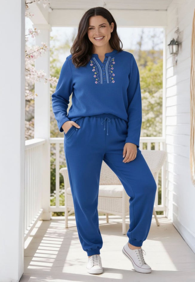 This comfortable thermal is lightweight and is perfect for all year around. This softly textured waffle knit fabric is sure to keep you comfortable. V-neck Henley front with metallic buttons and floral embroidery for a stunning effect. Soft and snuggly, this feminine style will feel good every time you put it on.