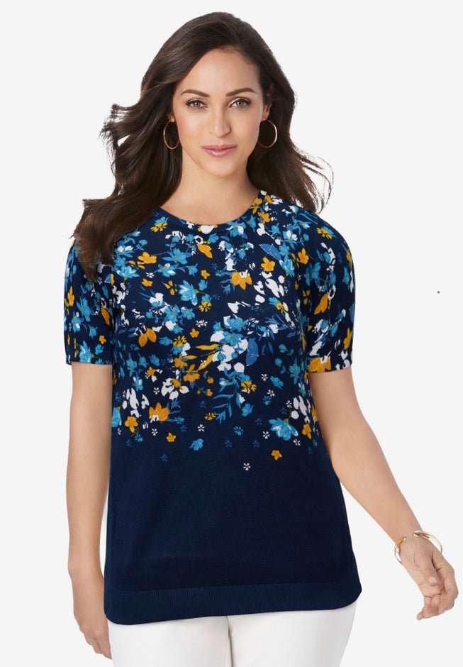 The Jessica London women's plus size Fine Gauge Collection Crewneck Shell is a fabulous, versatile classic that completes every wardrobe. Features a straight silhouette that flatters every figure and a crew neckline that conceals bra straps. Wear it on its own or as a twinset with the coordinating Jessica London Fine Gauge Collection Cardigan.