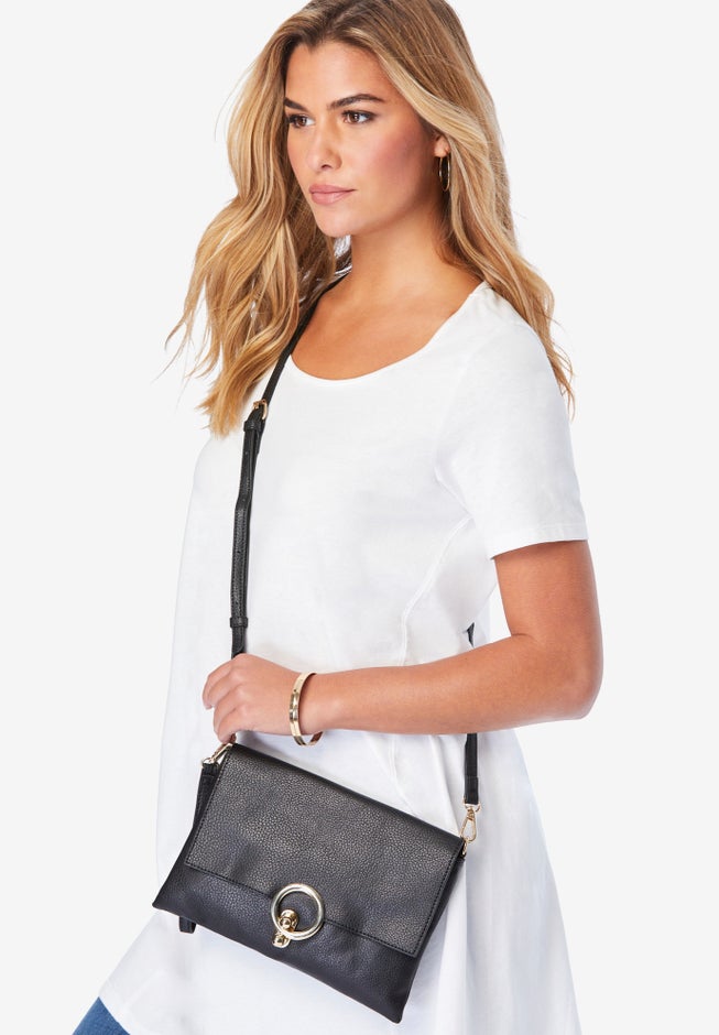 Made of faux pebbled leather, this convertible crossbody features a front flap closure with statement circle hardware. A roomy interior is made to keep you organized, including a zip compartment and credit card pockets to house all your necessities — including your phone. Features a removable shoulder strap for day wear and a delicate wristlet strap for evening. Also in Black.