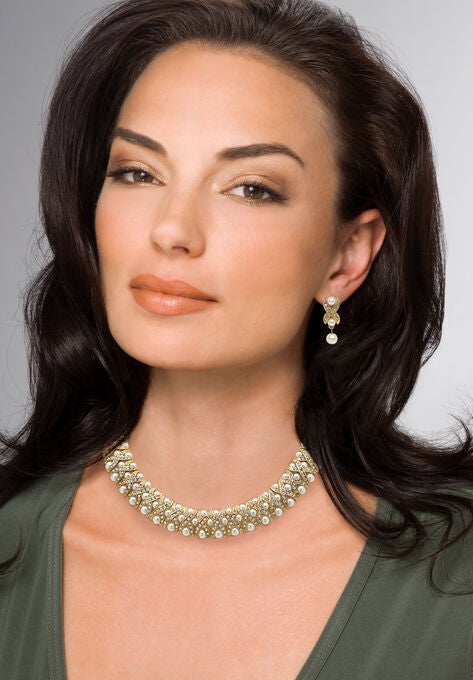The look of luxury for less. Magical crystals, memorable pearls and marvelous yellow gold tone join together to create this prized 3-piece jewelry set featuring golden X's interspersed with pearl rounds for a pretty interpretation of the classic "X and O" design. Includes 18" necklace, 71/2" bracelet and drop earrings.