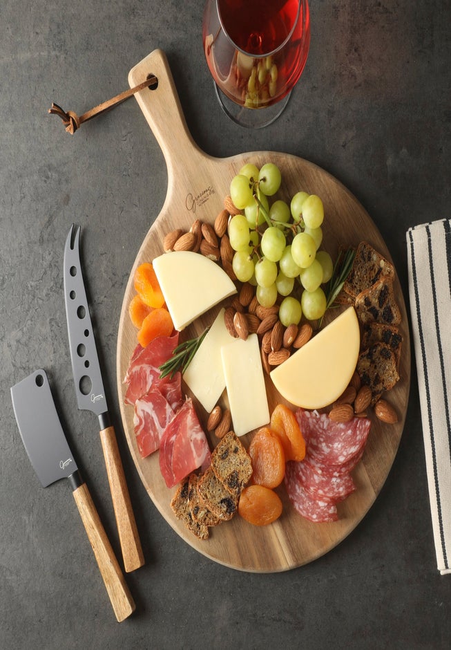 Craft the perfect cheese or charcuterie spread with this 3-piece Acacia Wood Board Set. Includes two stainless steel knives and a beautiful wood grain board that’s ready for entertaining