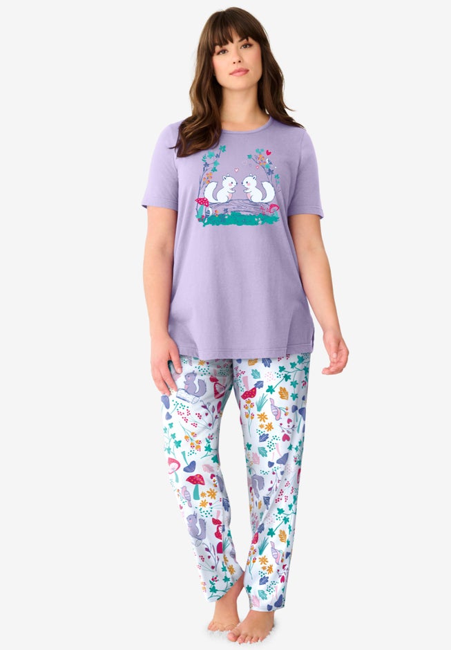 • Adorable graphic tee with small side slits paired with coordinating printed pajama pants for a charming look.