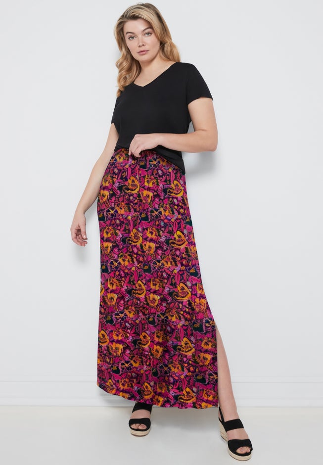 Item Number: 1009535Skirt has elastic drawstring waist and side slit. Slight A-line silhouette.