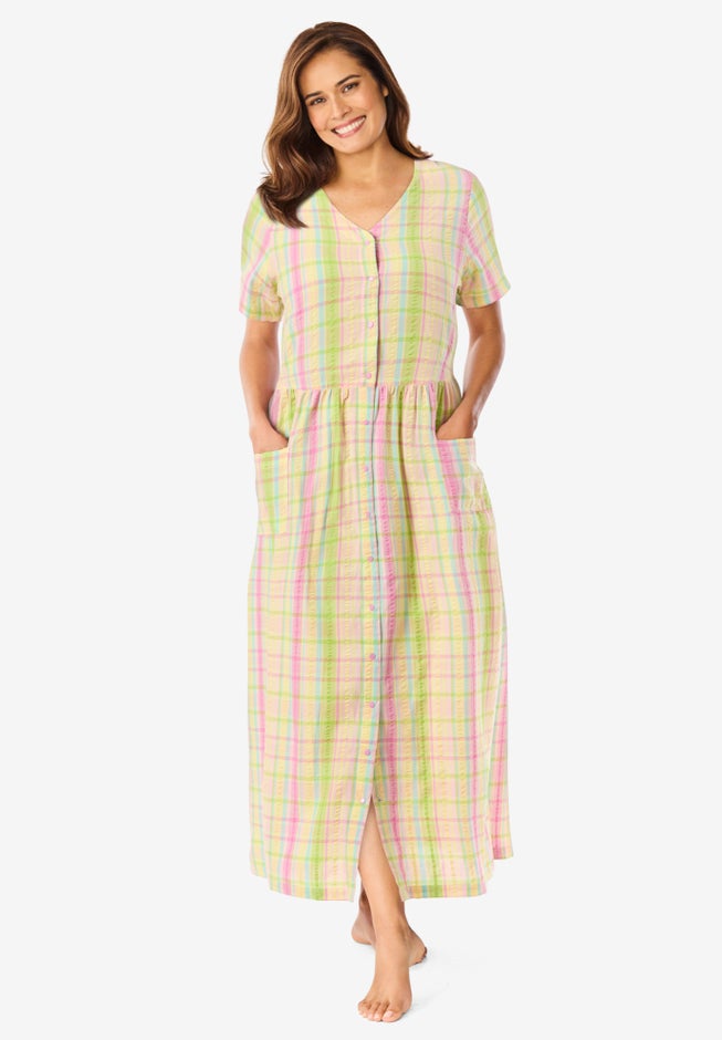 Made in lightweight seersucker fabric for warmer weather, this lounge dress looks great and keeps you cool. A snap-button front and shirred empire waist give the look of a casual dress that makes this perfect for wearing around the house.