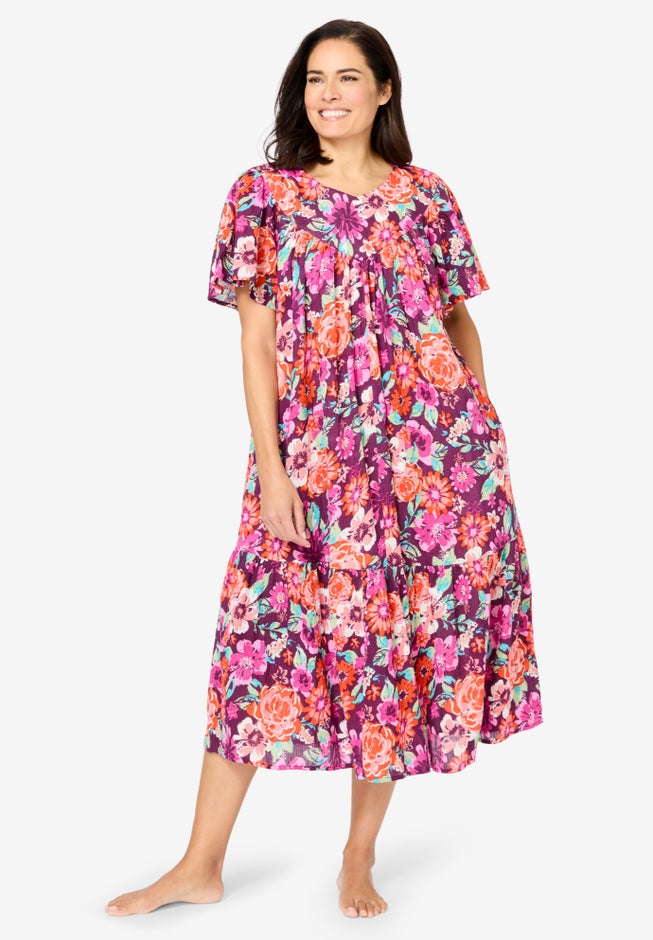 Lounge around in this airy Gauze Lounger. Relaxed v-neckline with neck shirring. Elbow length raglan sleeves and tiered bottom. Side pockets to carry your essentials.