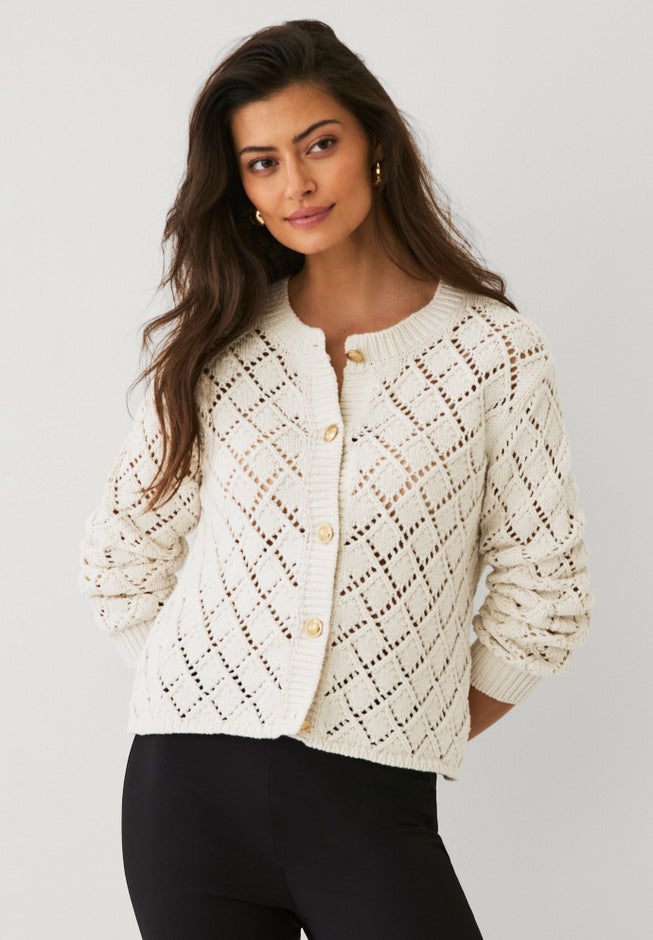 Item Number: 1115480This open-work cardigan gives you lightweight layering with added texture. Worn over tees and tanks, it feels casual and easy; draped over dresses, it offers a polished finish.