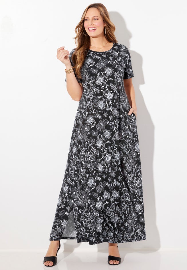 FIT: Everyone's favorite length for easy dressing and ultimate comfort, maxi dresses never fail to make a statement. Scoop neck. Short sleeves. Princess seams. Pockets. Slits along front seams at hem. No closure, easy pull-over style.