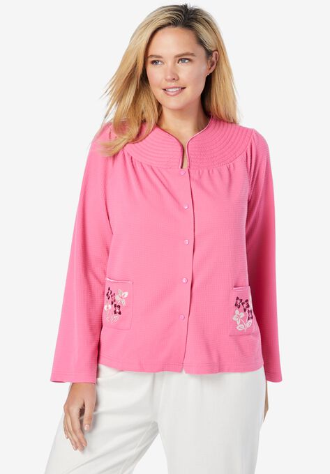 Comfy softly textured knit bed jacket with embroidery on the patch pockets.
