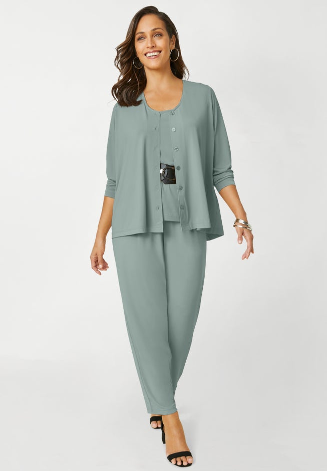 This women’s plus size four-piece wardrober takes the guesswork out of getting dressed. Featuring a collarless jacket, straight-leg pant, sleeveless tank and a coordinating dress, each piece layers effortlessly for endless outfit combinations in comfortable stretch knit.