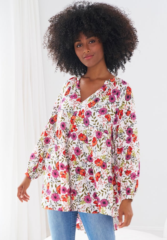 Item Number: 1057621This two-tier, A-line tunic adds a light, femme look to your fall wardrobe. Blouson sleeves feature stretch cuffs you can push up when you’re feeling casual.